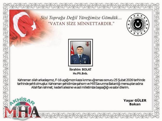 Milli Savunma Bakanlığı tarafından sabah saatlerinde, sanal medya hesabından yapılan paylaşımda, "Kahraman silah arkadaşımız Hava Pilot Binbaşı İbrahim Bolat, F-16 uçağımızın kaza kırma uğraması sonucu, 25 Şubat 2026 tarihinde şehit olmuştur. Kahraman şehidimize şahsım ve Milli Savunma Bakanlığı mensupları adına Allah'tan rahmet; kederli ailesine ve asil milletimize başsağlığı ve sabır dilerim” ifadeleri kullanıldı.