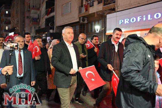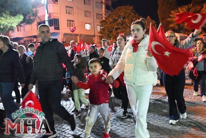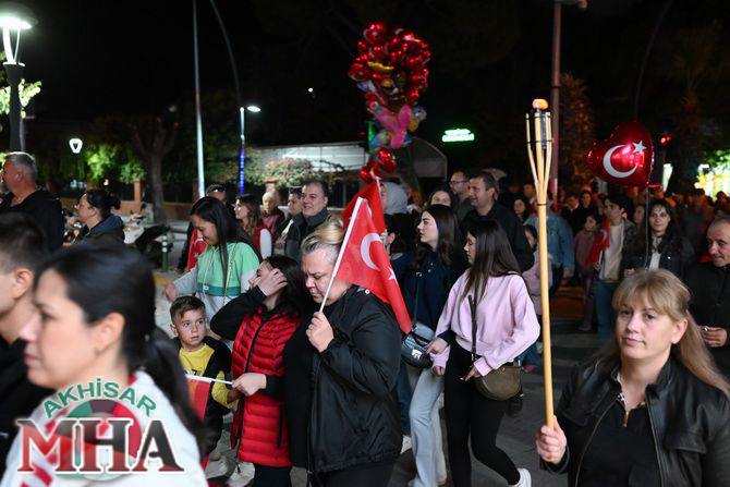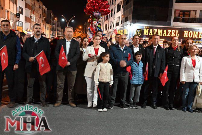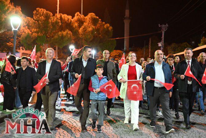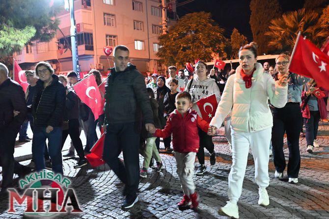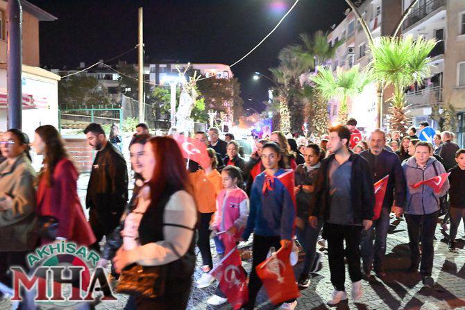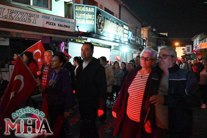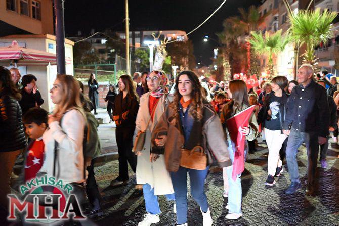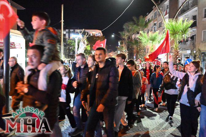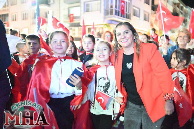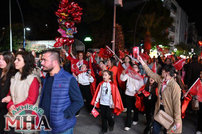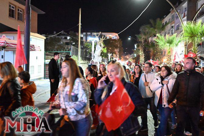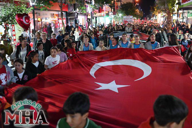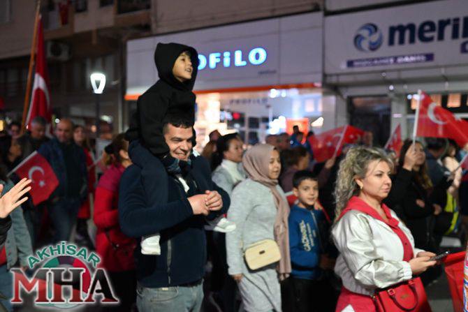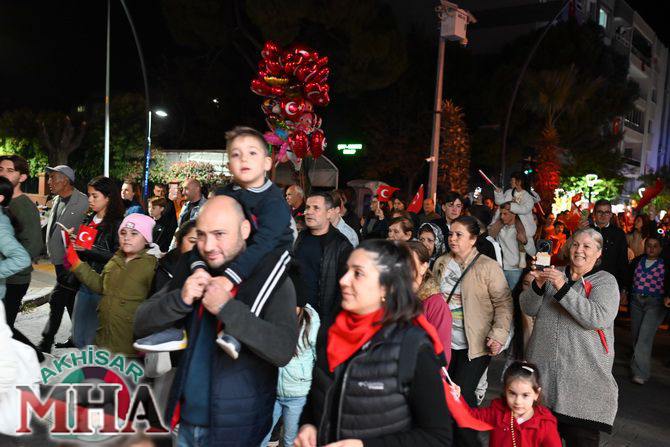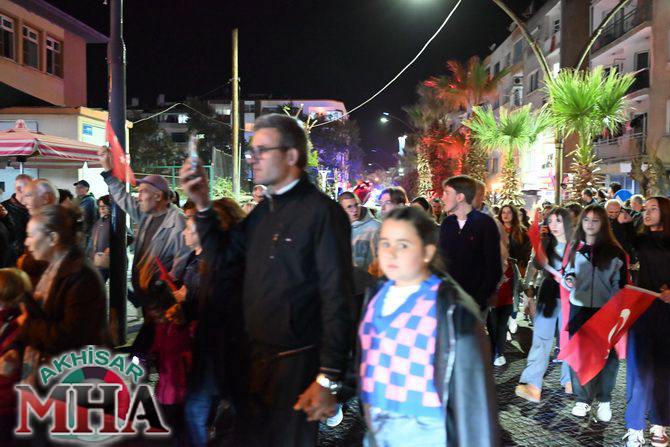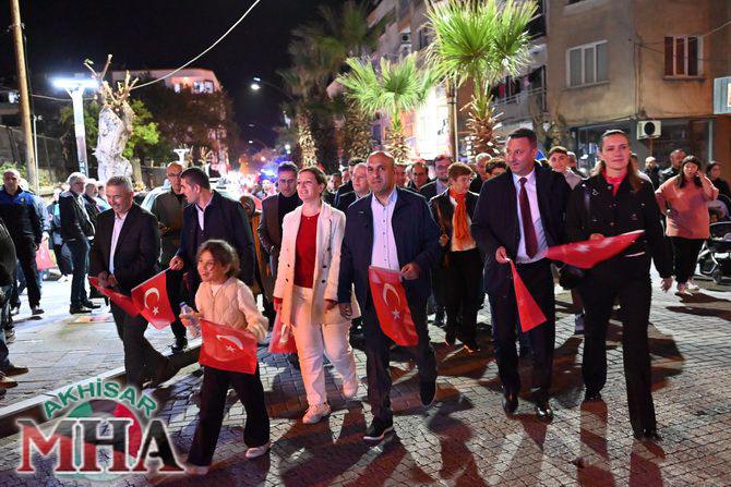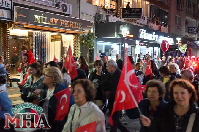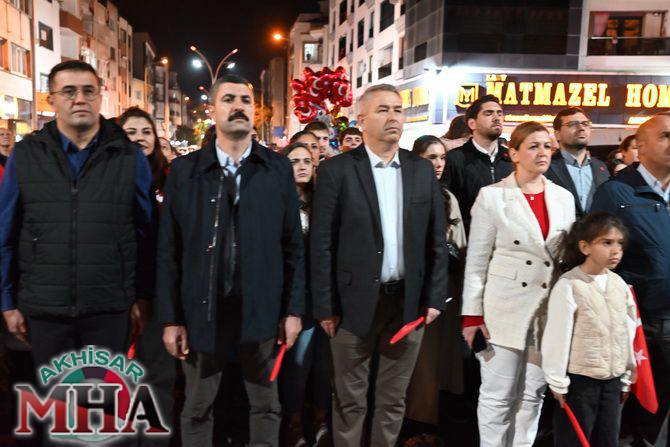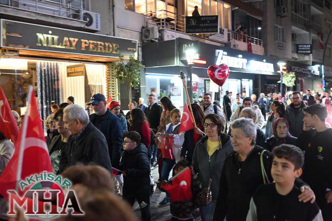 Saat 20.00’de ise Akhisar Kaymakamı Mustafa Can, Akhisar Belediye Başkanı Ekrem Kayserili, Cumhuriyet Başsavcısı Sebahattin Erkaya ve binlerce Akhisarlı, okul bandosunun öncülüğünde fener alayında buluştu. Ellerinde Türk ve Atatürk bayraklarıyla yürüyen kalabalık, Misak-ı Milli Okulu bahçesinden başlayarak Şehit Teğmen Tahir Ün Caddesi ve Birinci Nakliye Caddesi üzerinden Milli Egemenlik Meydanı’na ulaştı.