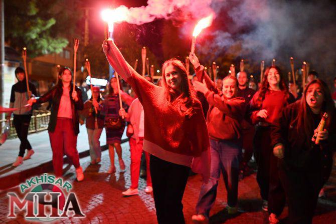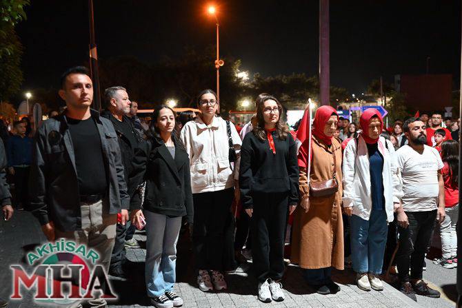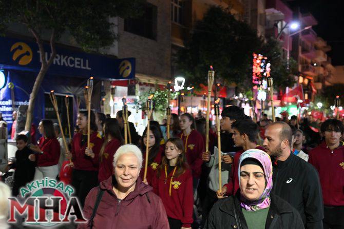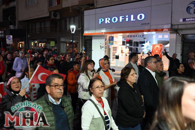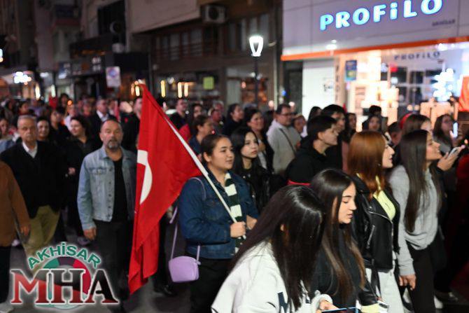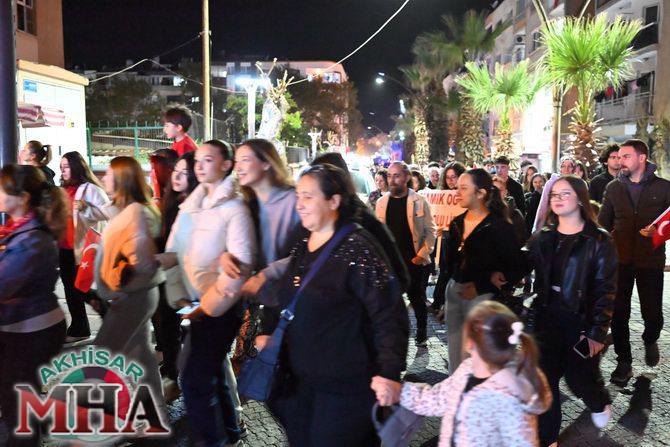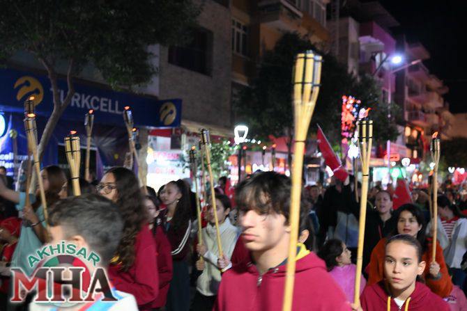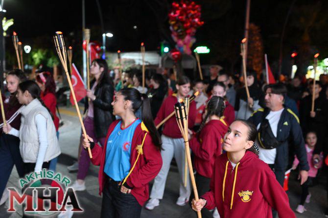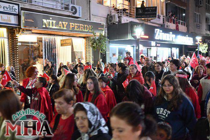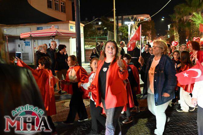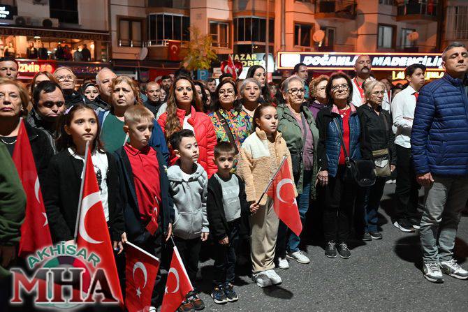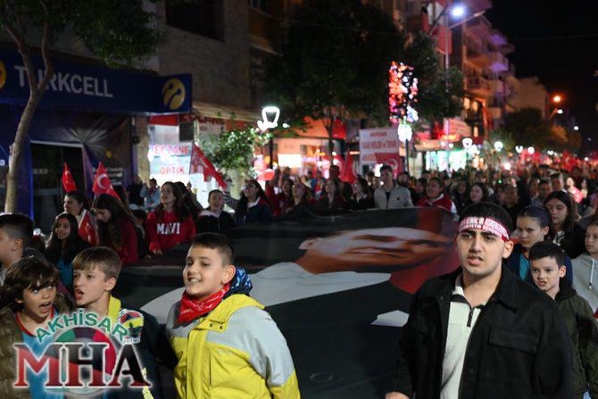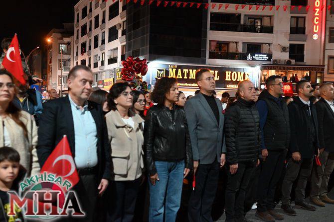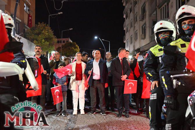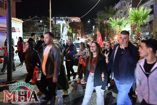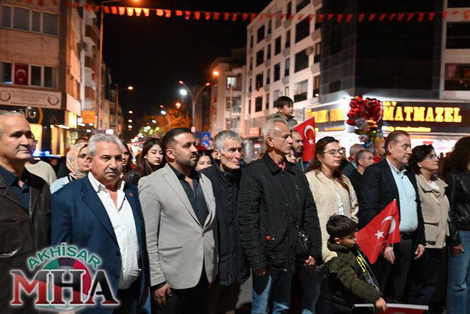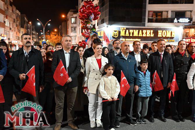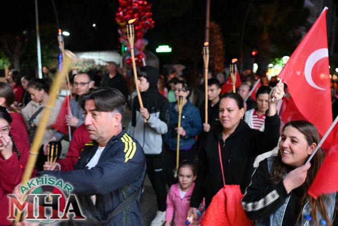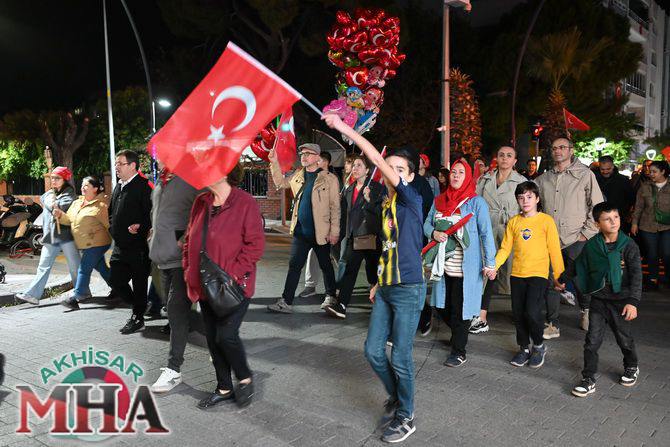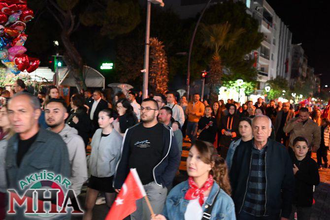 Saat 20.00’de ise Akhisar Kaymakamı Mustafa Can, Akhisar Belediye Başkanı Ekrem Kayserili, Cumhuriyet Başsavcısı Sebahattin Erkaya ve binlerce Akhisarlı, okul bandosunun öncülüğünde fener alayında buluştu. Ellerinde Türk ve Atatürk bayraklarıyla yürüyen kalabalık, Misak-ı Milli Okulu bahçesinden başlayarak Şehit Teğmen Tahir Ün Caddesi ve Birinci Nakliye Caddesi üzerinden Milli Egemenlik Meydanı’na ulaştı.