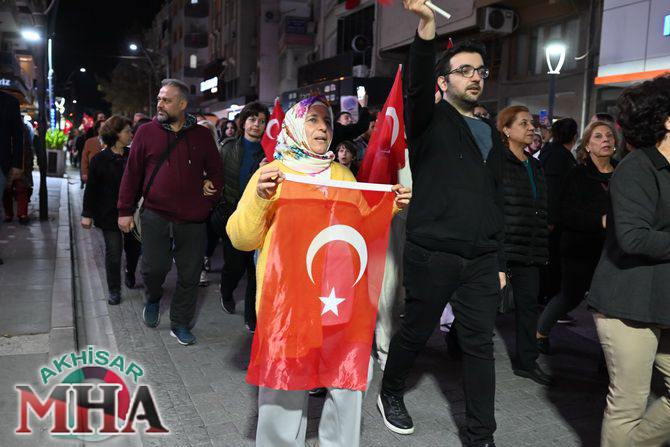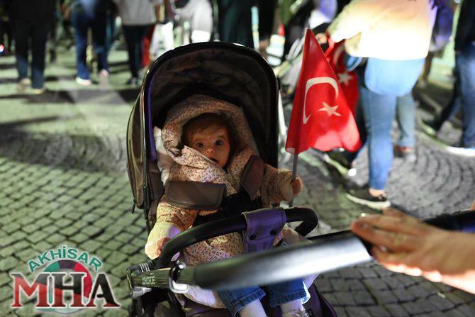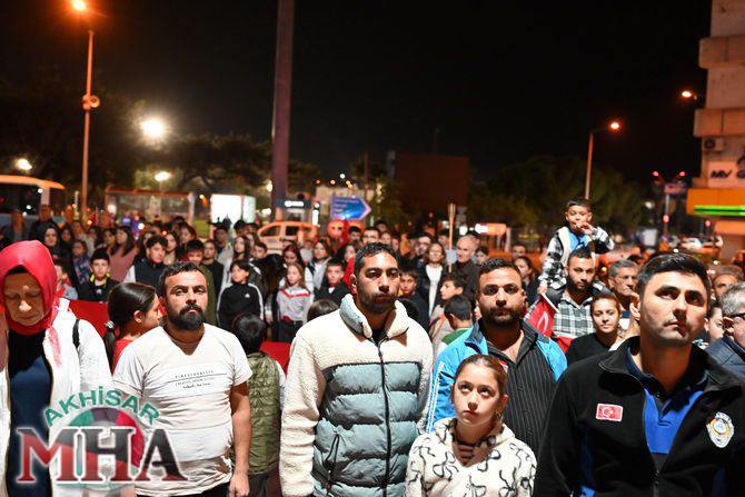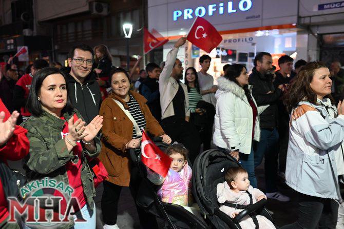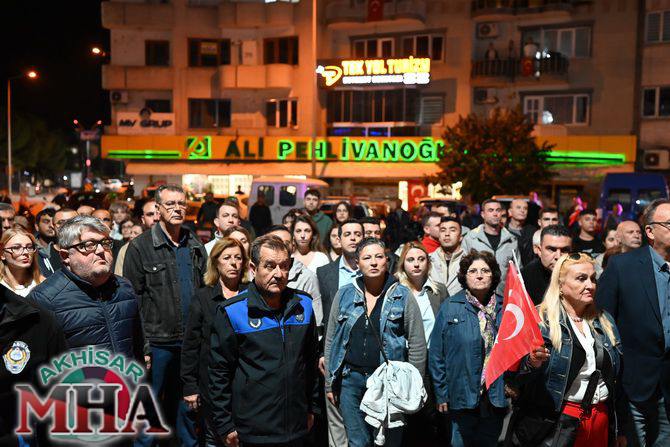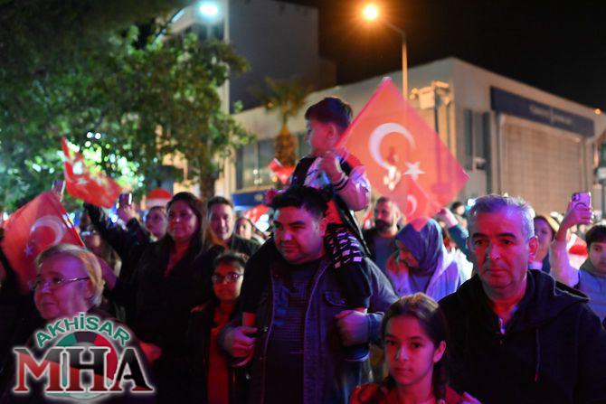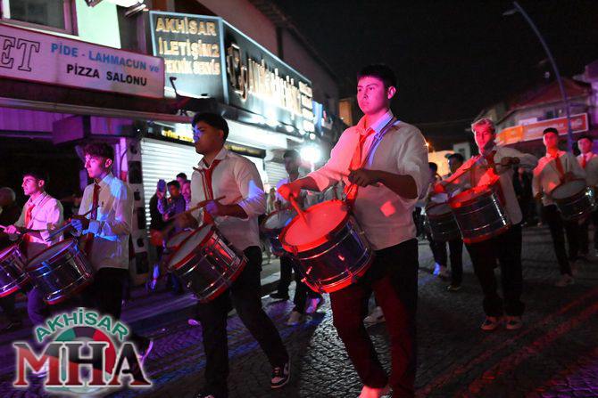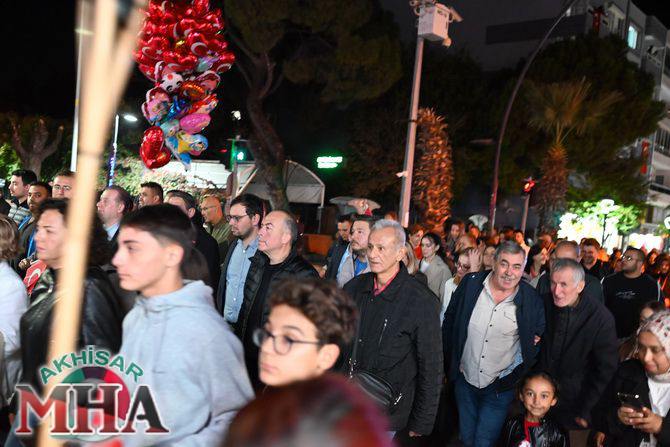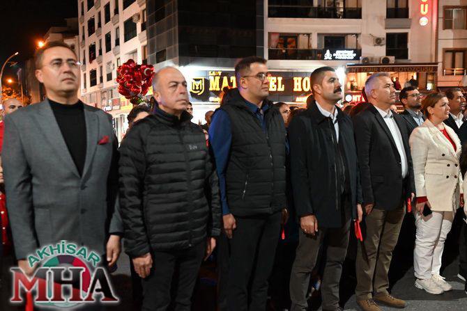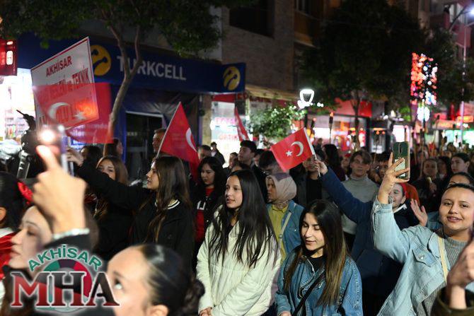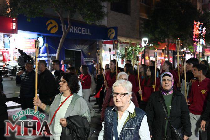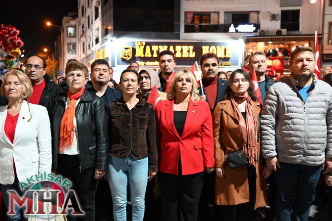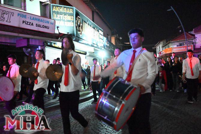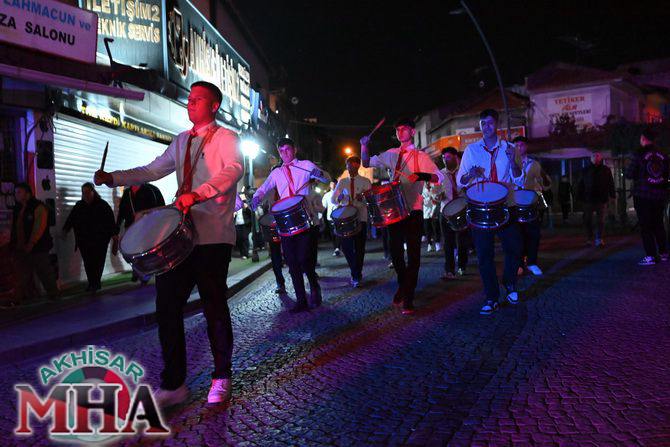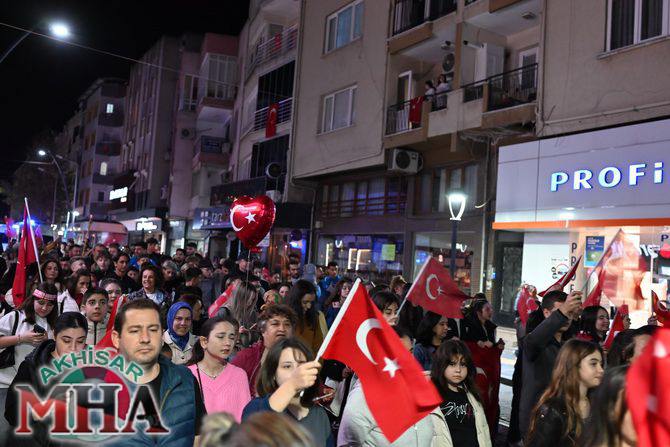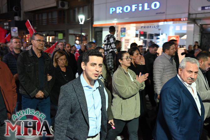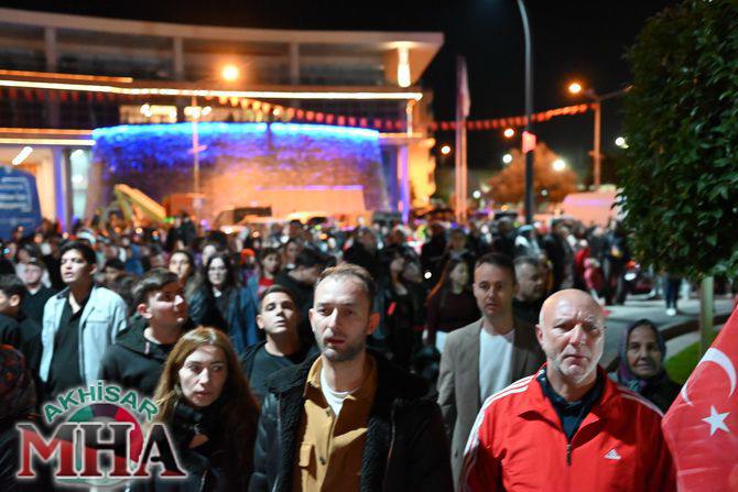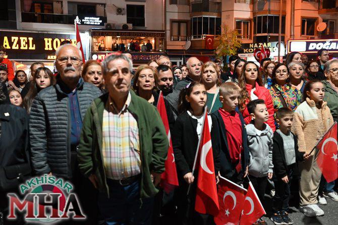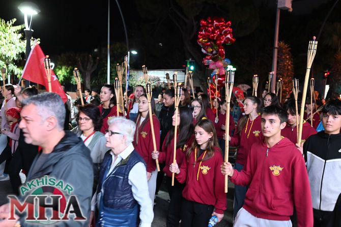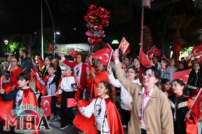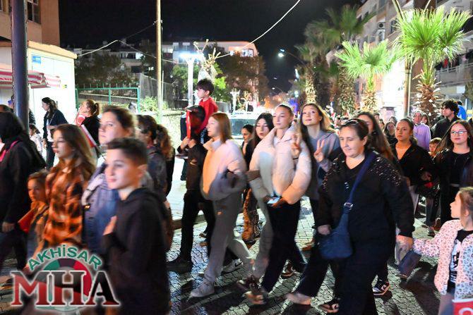 Saat 20.00’de ise Akhisar Kaymakamı Mustafa Can, Akhisar Belediye Başkanı Ekrem Kayserili, Cumhuriyet Başsavcısı Sebahattin Erkaya ve binlerce Akhisarlı, okul bandosunun öncülüğünde fener alayında buluştu. Ellerinde Türk ve Atatürk bayraklarıyla yürüyen kalabalık, Misak-ı Milli Okulu bahçesinden başlayarak Şehit Teğmen Tahir Ün Caddesi ve Birinci Nakliye Caddesi üzerinden Milli Egemenlik Meydanı’na ulaştı.