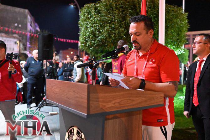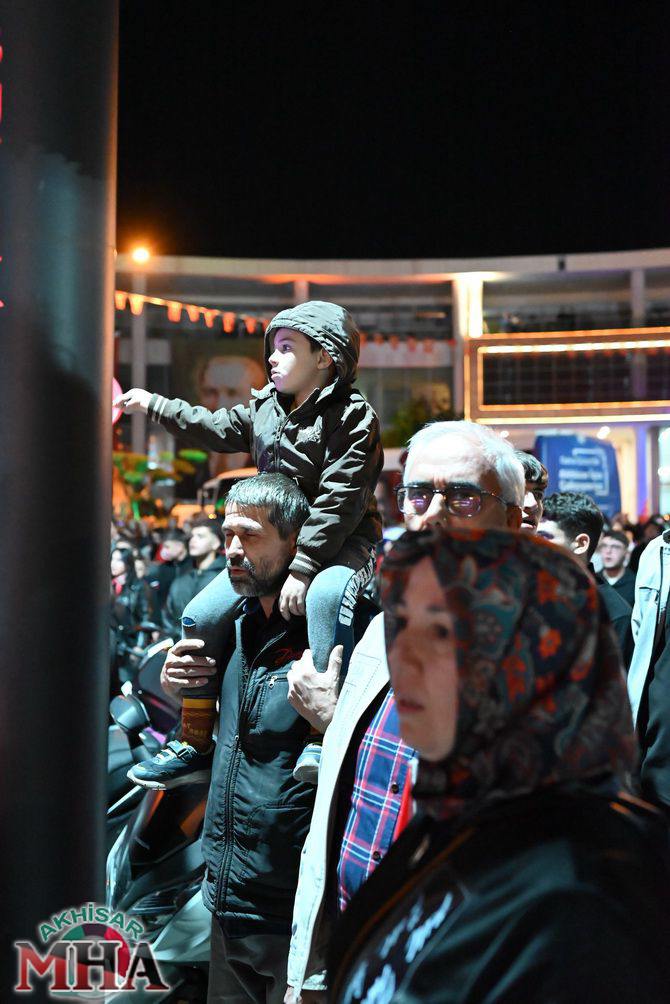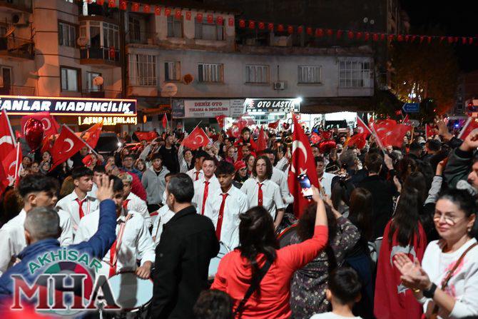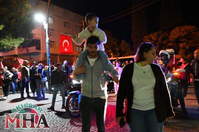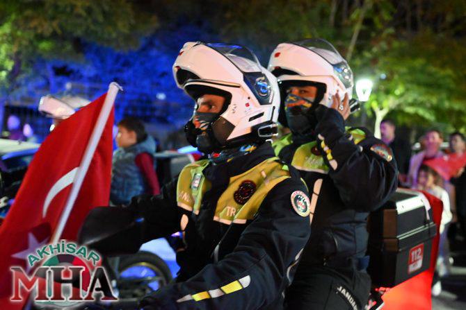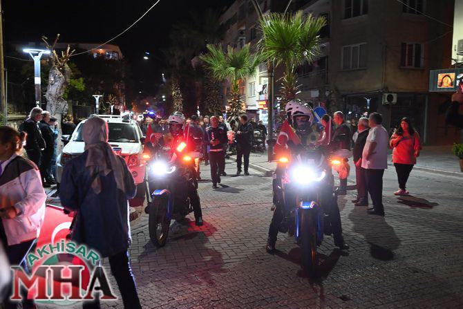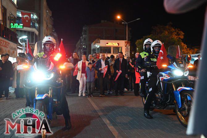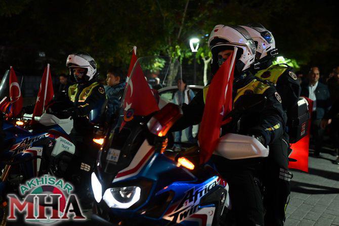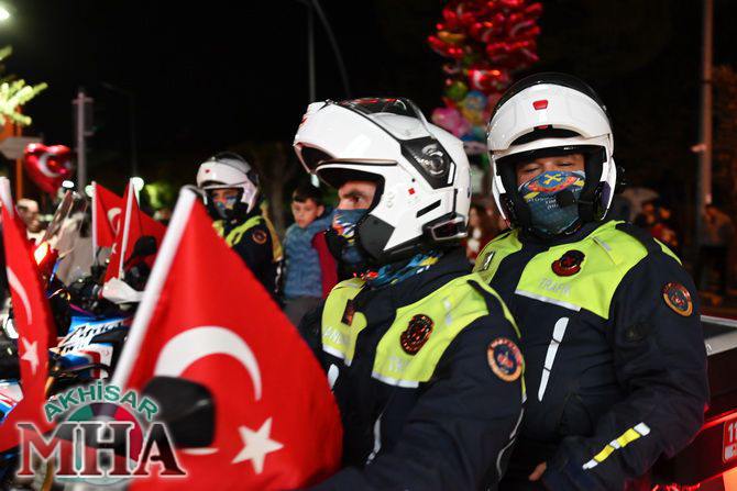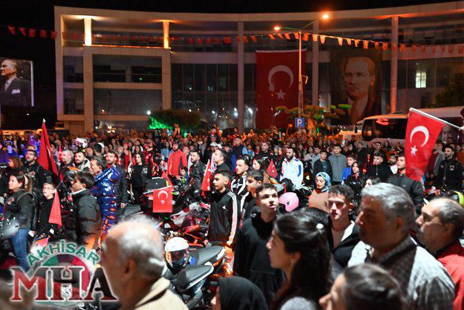 Kutlama etkinlikleri kapsamında ilk olarak saat 19.45’te Akhisarlı motosiklet tutkunları, Türk bayraklarıyla donattıkları motosikletleriyle Misak-ı Milli İlkokulu önünden kortej halinde yola çıktı. Kent sokaklarını kırmızı-beyaz renklere bürüyen konvoy, vatandaşlardan büyük alkış aldı.