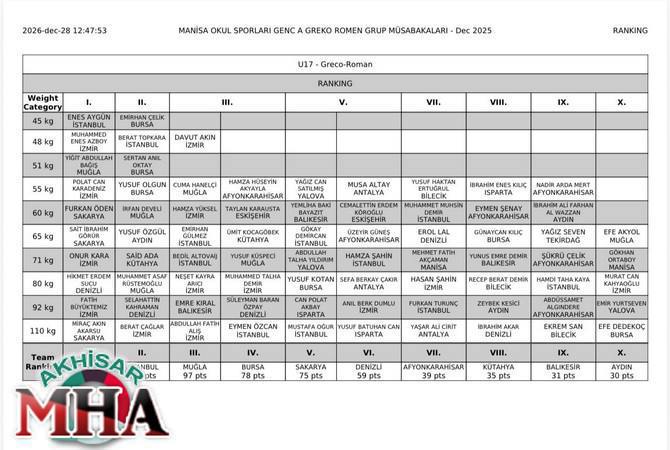 Gençlik ve Spor Bakanlığı Okul Sporları faaliyet programında yer alan Gençler(A) Serbest ve Grekoromen Erkek Güreş Grup Müsabakaları 25-28 Aralık 2025 tarihlerinde ilçemiz Merkez Spor Salonunda yapıldı.