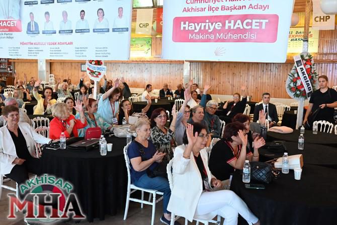 Cumhuriyet Halk Partisi (CHP) Akhisar İlçe Başkanlığı’nın 39. Olağan İlçe Kongresi, 27 Eylül Cumartesi günü Otel Tütün’de gerçekleştirildi. Tek listeyle seçimlere giren mevcut ilçe başkanı Hayriye Hacet, delegelerin oylarıyla yeniden başkanlığa seçildi.
