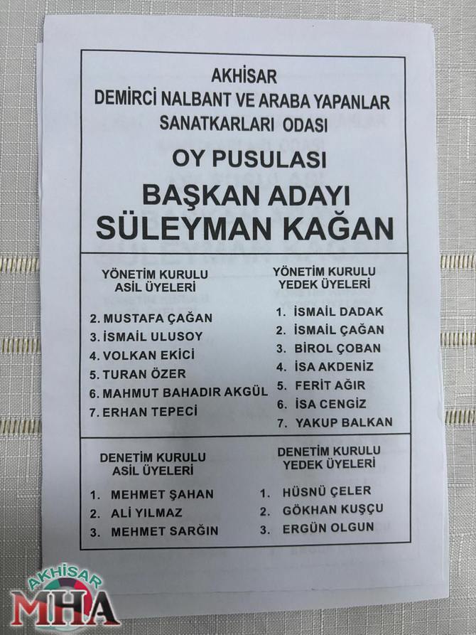 Akhisar Demirci Nalbant ve Araba Yapanlar Sanatkarlar Odası'nın olağan genel kurul seçimleri, oda üyelerinin yoğun katılımıyla gerçekleştirildi. Mevcut başkan Süleyman Kağan, tek liste halinde girdiği seçimde, kullanılan oyların büyük çoğunluğunu alarak yeniden başkanlığa seçildi.