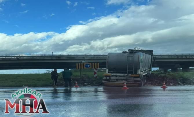 Edinilen bilgilere göre, sabah saatlerinde etkili olan yoğun yağış, bölgedeki trafik akışını olumsuz etkiledi. Gölmarmara-Kayalıoğlu çevreyolu kavşağında, Manisa istikametine seyir halinde olan bir tır, zeminindeki kayganlık nedeniyle virajı alamayarak orta refüje çıktı. Sürücüsünün direksiyon hakimiyetini kaybetmesi sonucu kontrolden çıkan tır, yol kenarındaki toprak alana ve refüje çarparak durabildi.